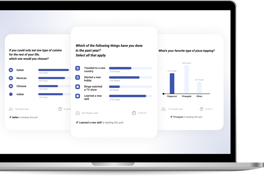 Need feedback on a new office layout? Planning a surprise party for your best friend? Curious who your friends think will win the big game? Whatever your reason, unleash your inner pollster with our free and easy-to-use poll & survey maker!